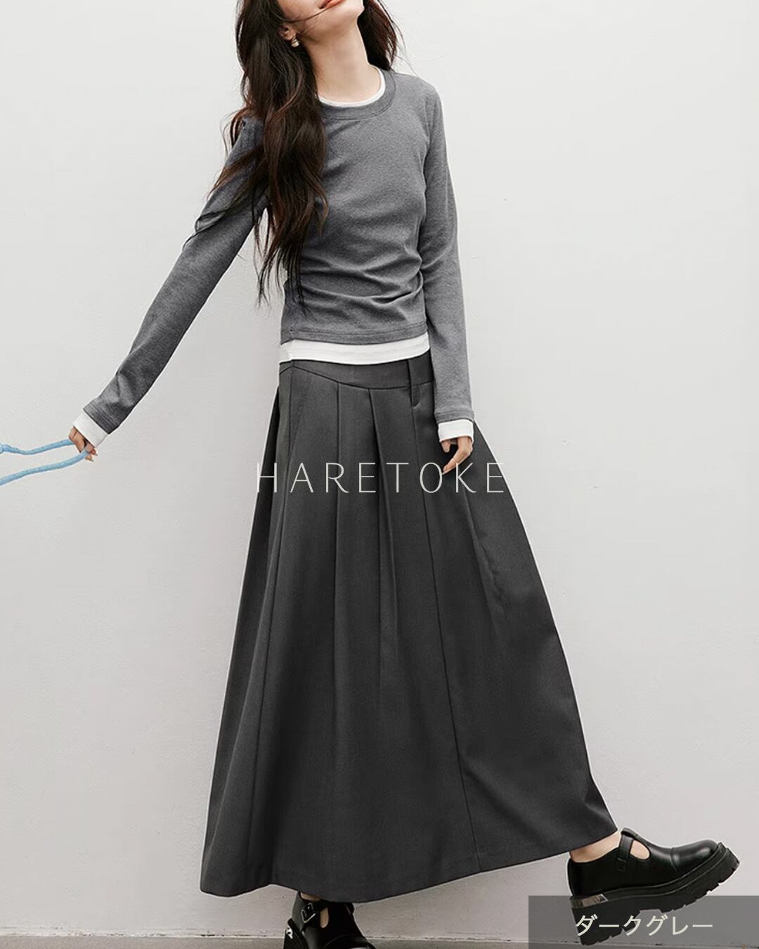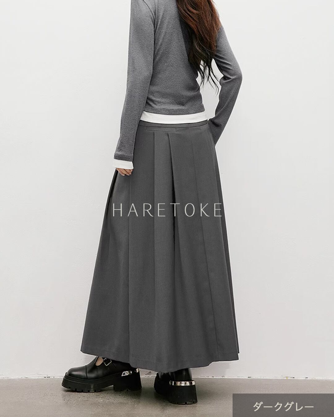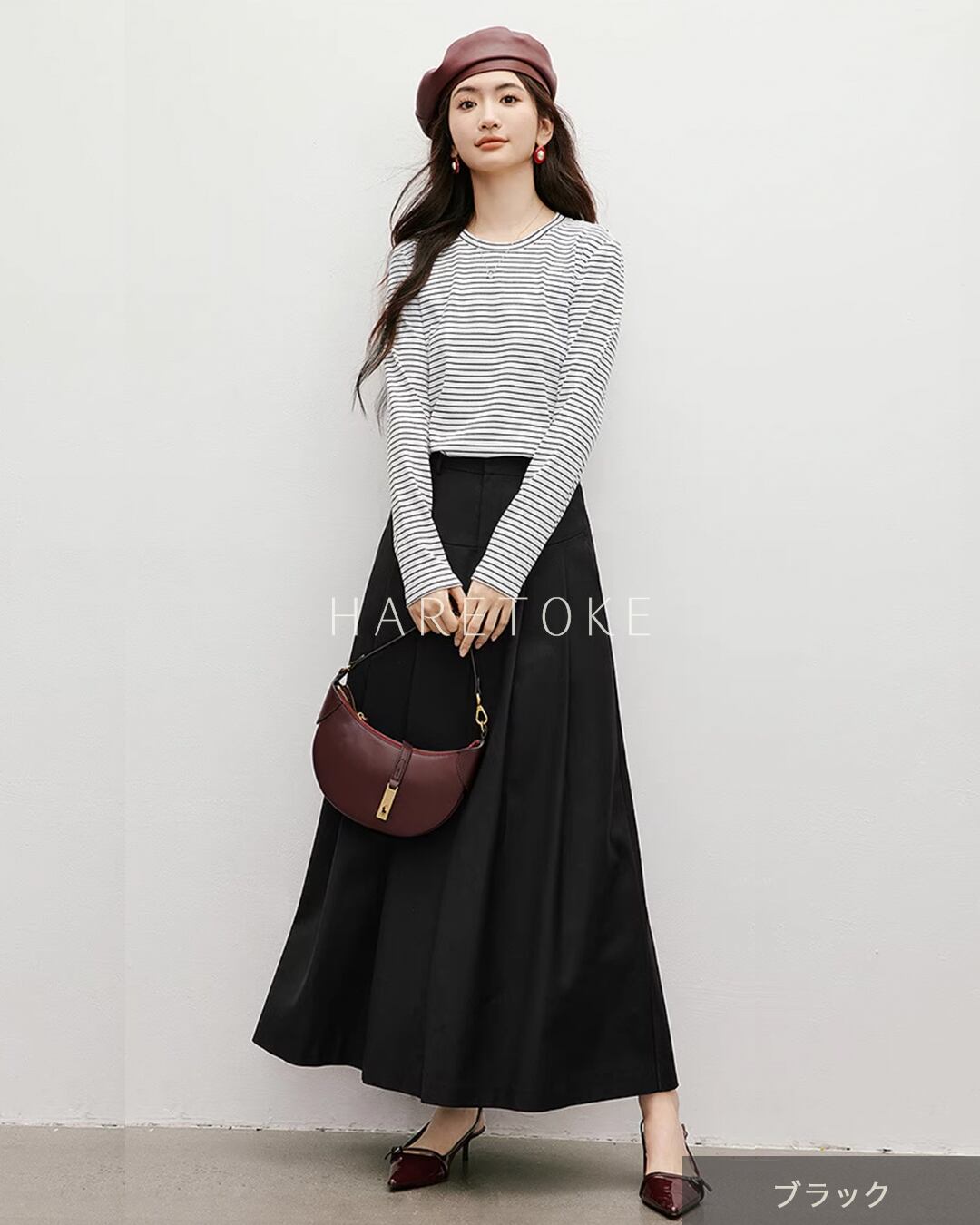上品なツイル生地と大きめプリーツが印象的な、美ラインのプリーツロングスカート。