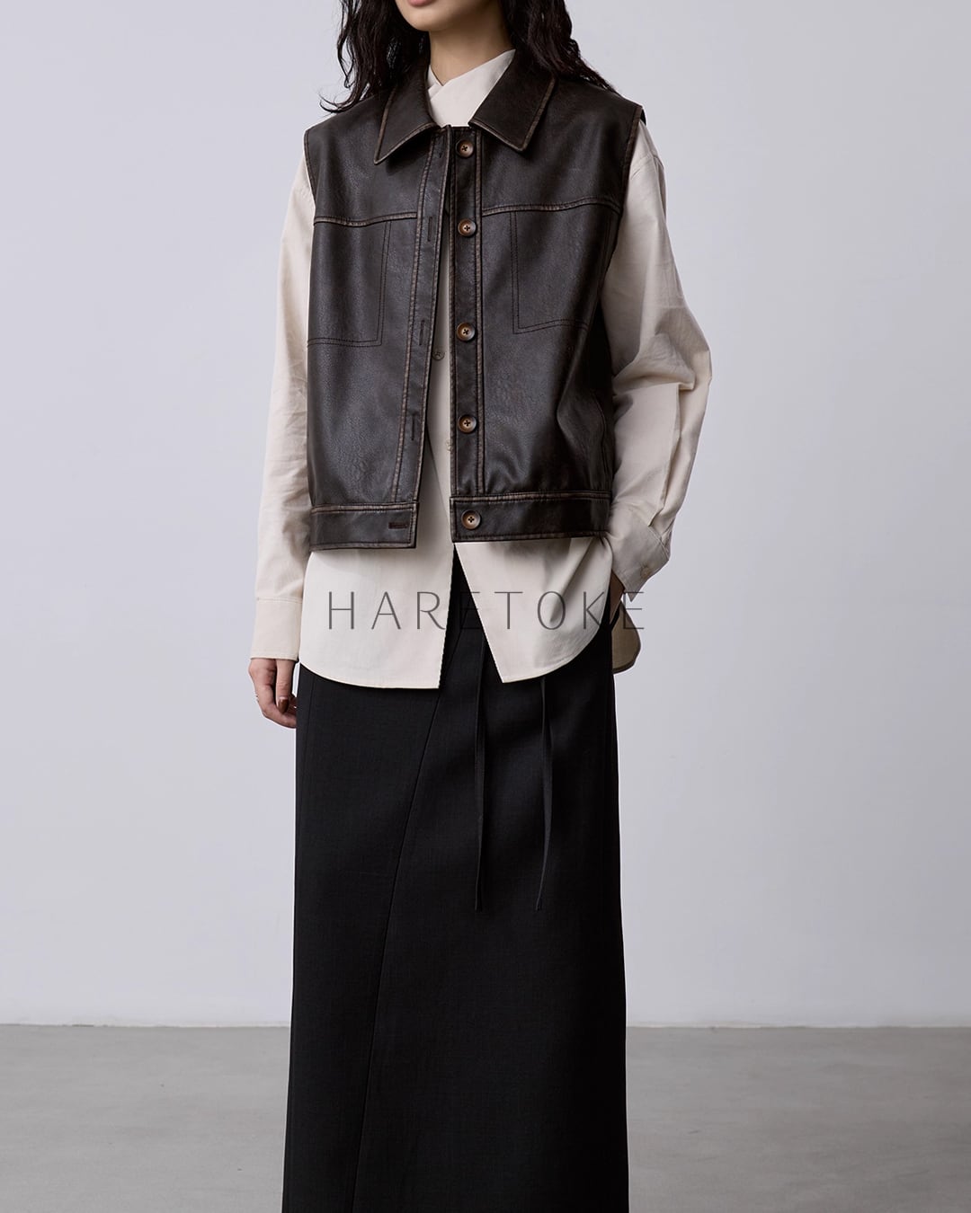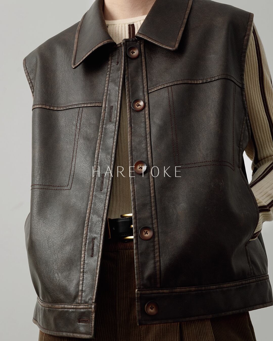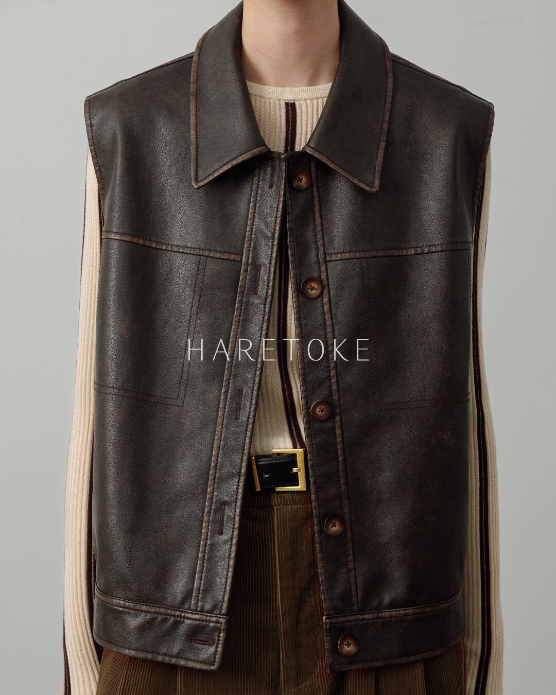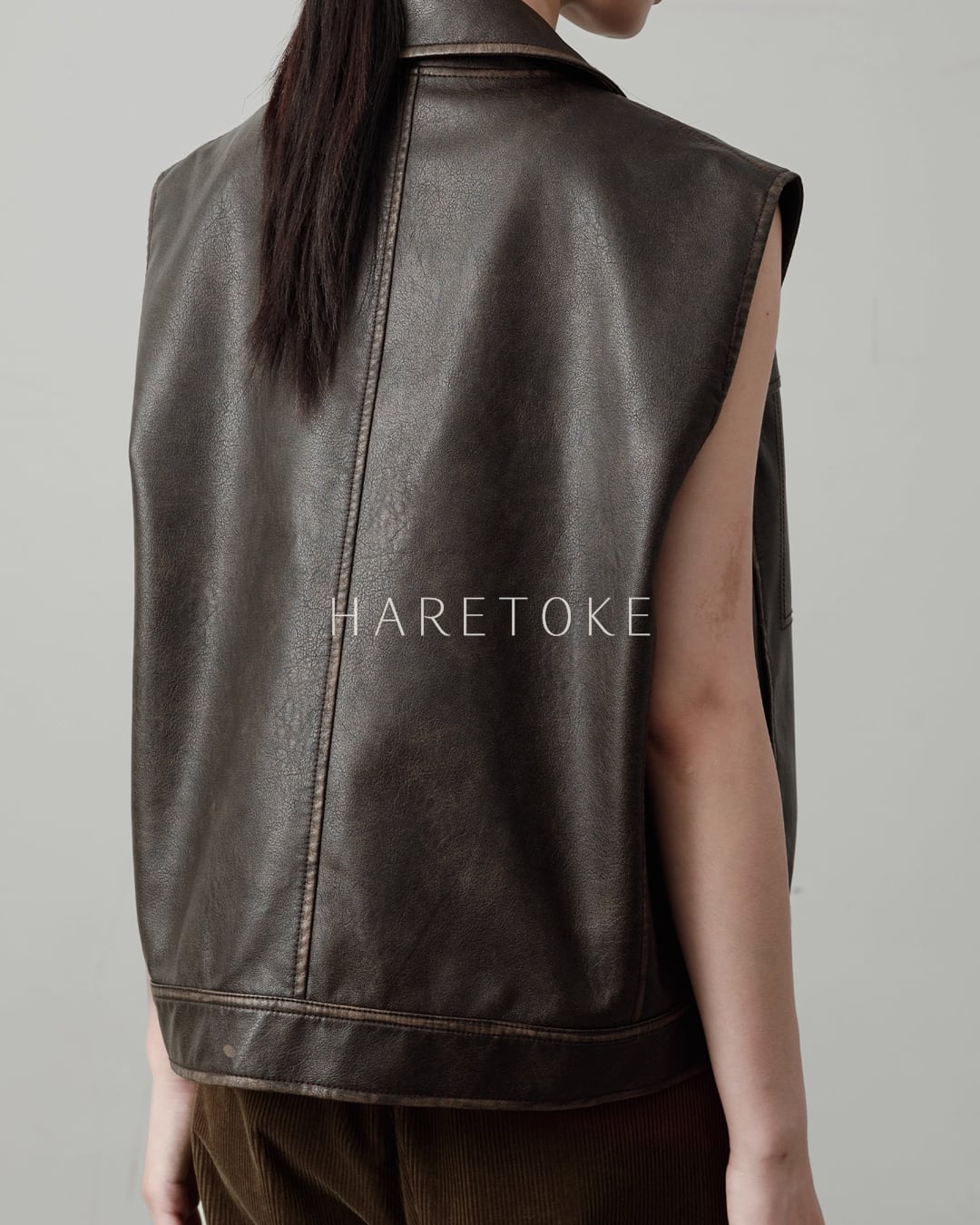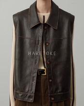 落ち着いた光沢感とヴィンテージライクな風合いが魅力の、フェイクレザー・ノースリーブジャケット。
