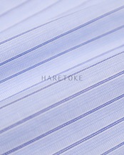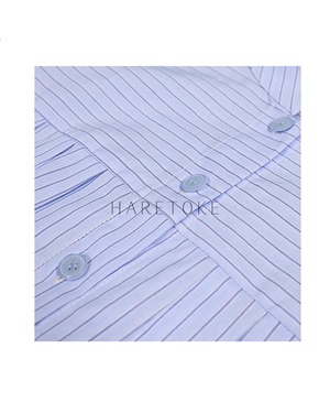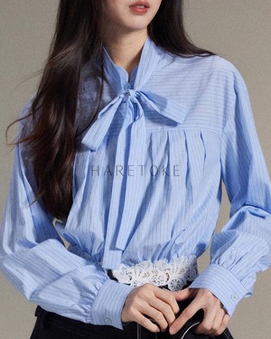 爽やかなブルー×ホワイトのストライプに、襟元のリボン結びをあしらったフェミニンなブラウス。