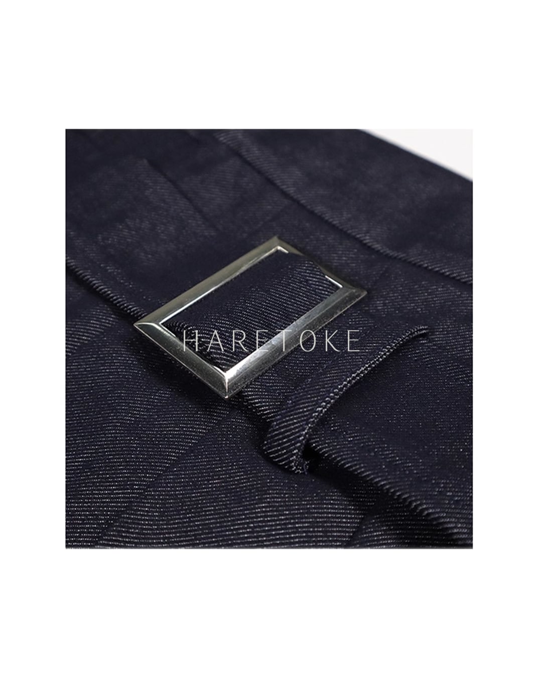 ハイウエストのベルトとメタルバックルがポイントとなり、ラフさの中に繊細なこだわりをプラスしています。