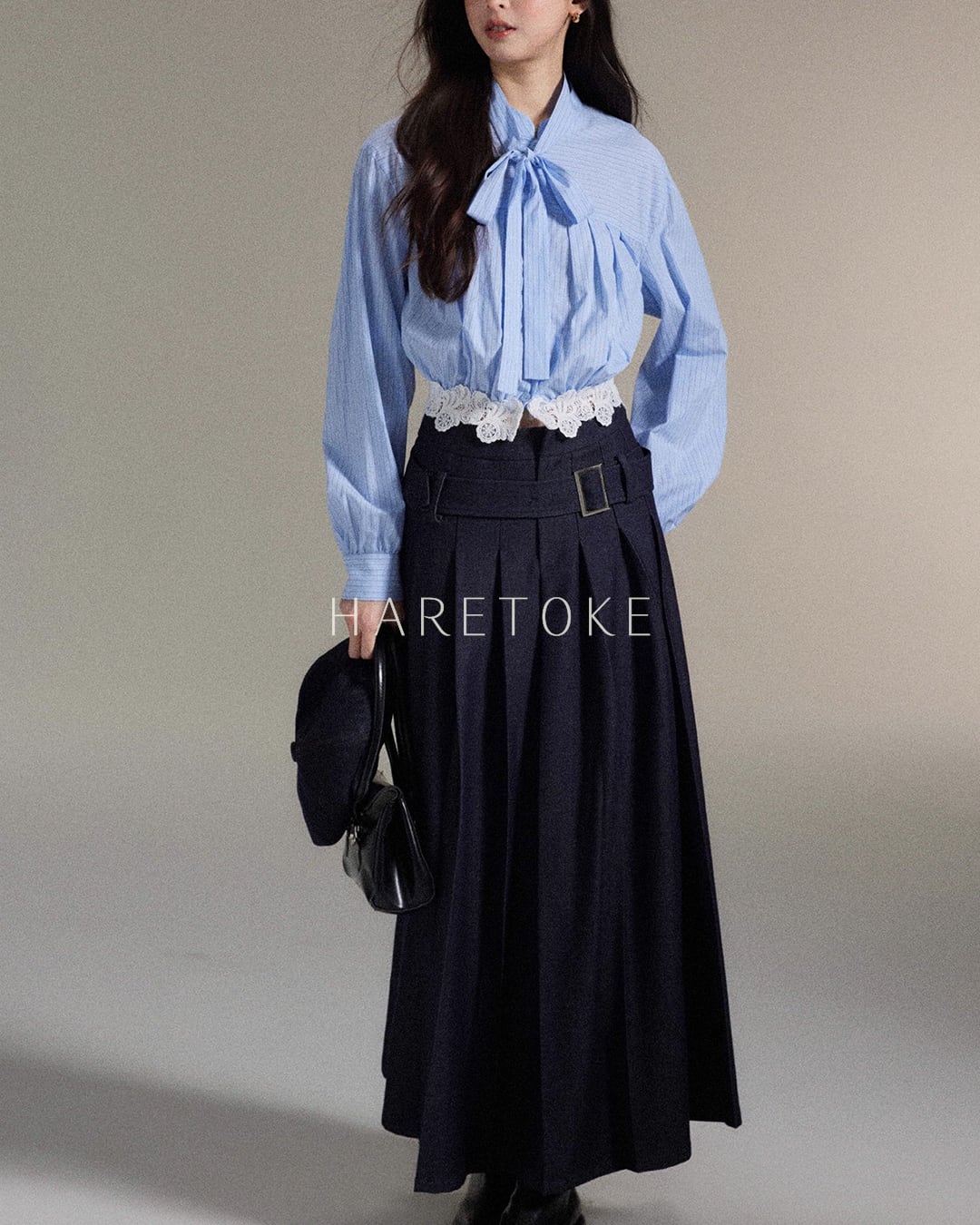 季節の変わり目にも合わせやすく、ブルーストライプのブラウスと合わせればクラシカルで甘いムードに。