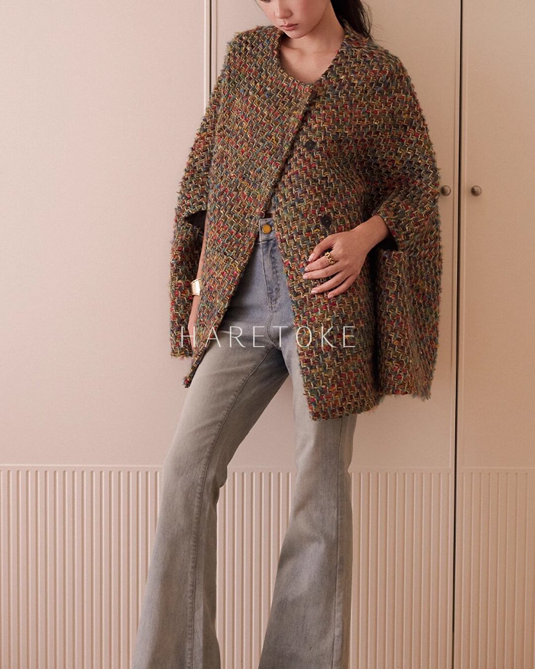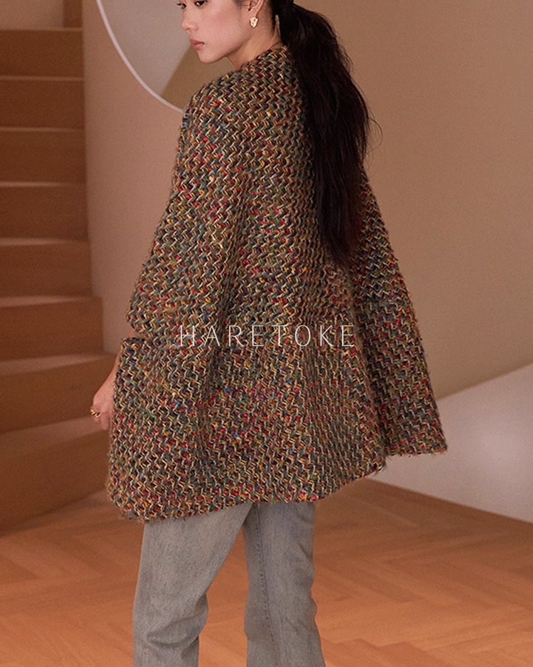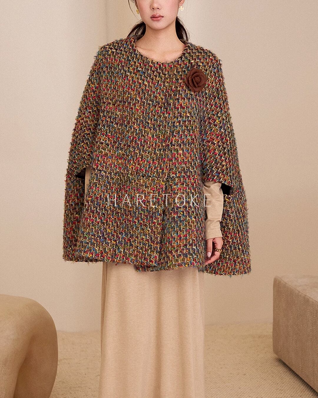 数種類の糸をミックスし、表情豊かな色合いのノーカラージャケット。
