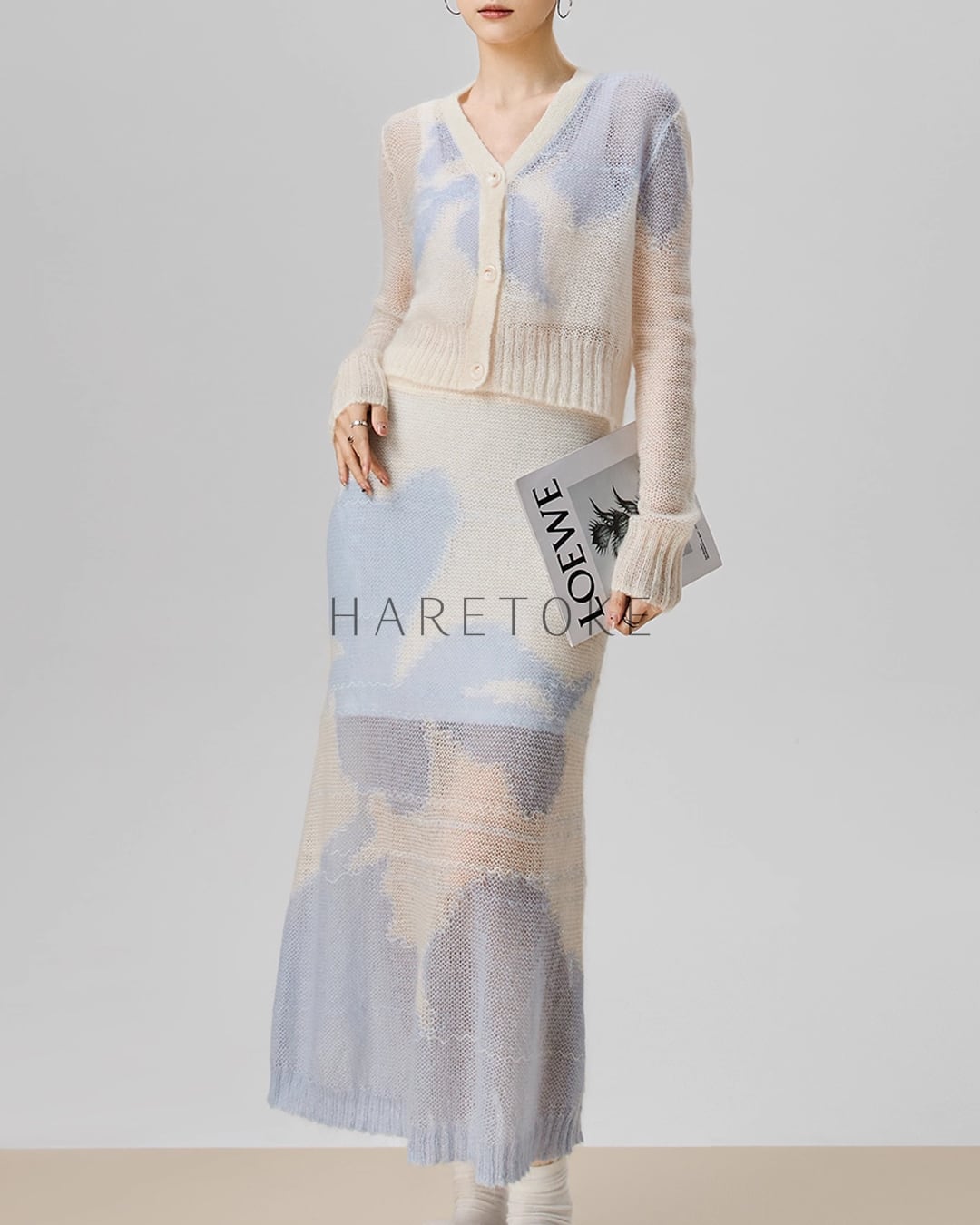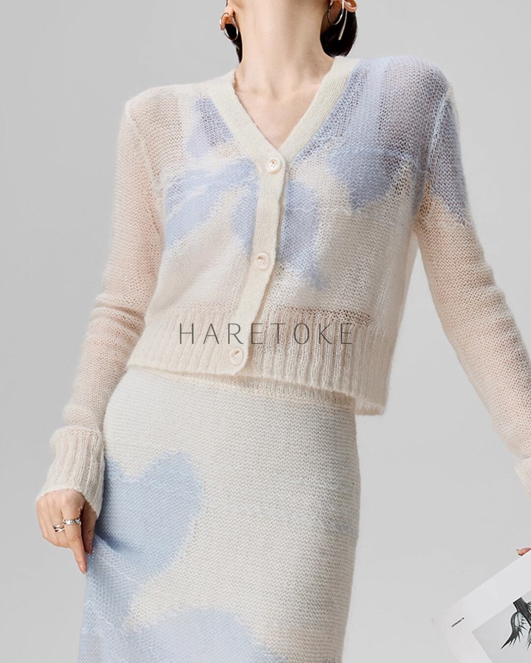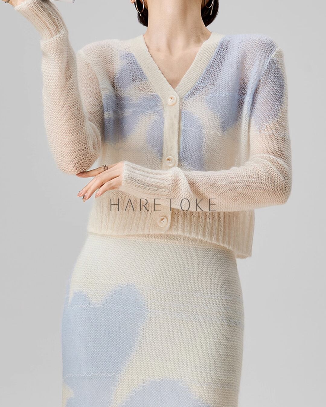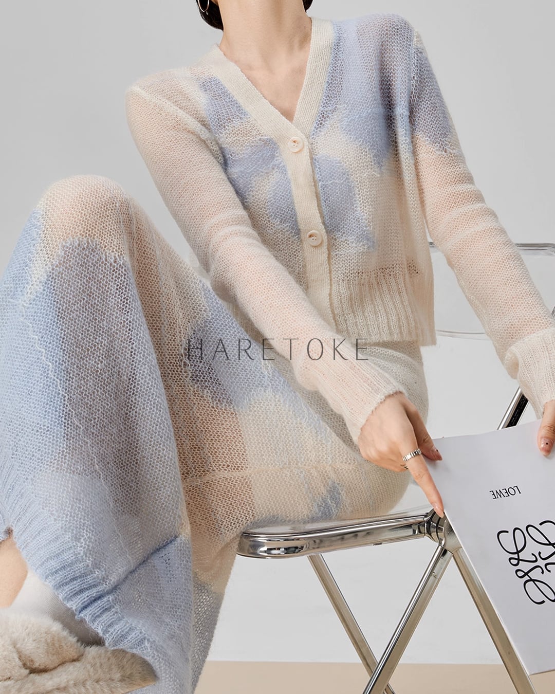 ブルーとホワイトの柔らかなグラデーションが美しい、上品なモヘアニットセットアップ。
