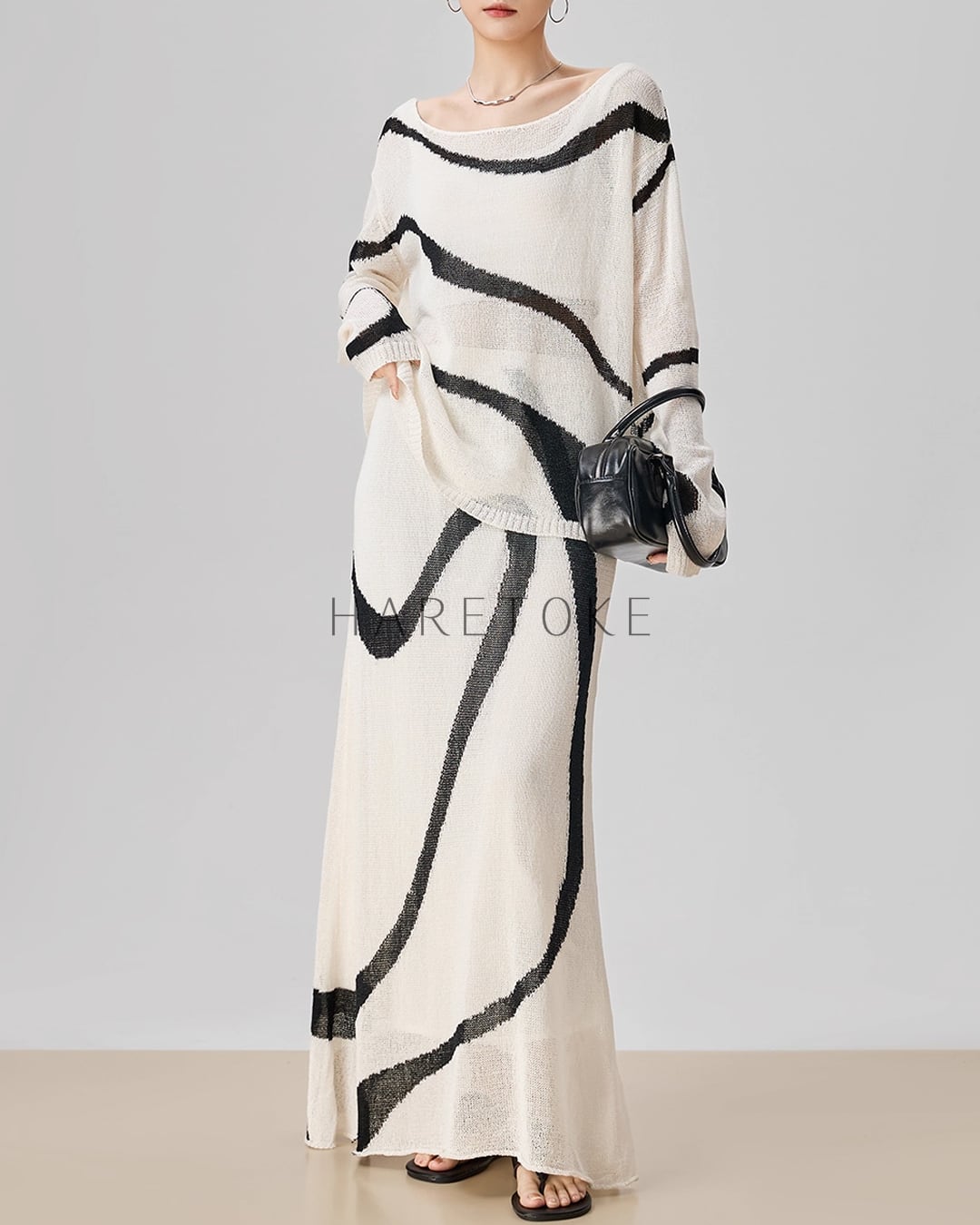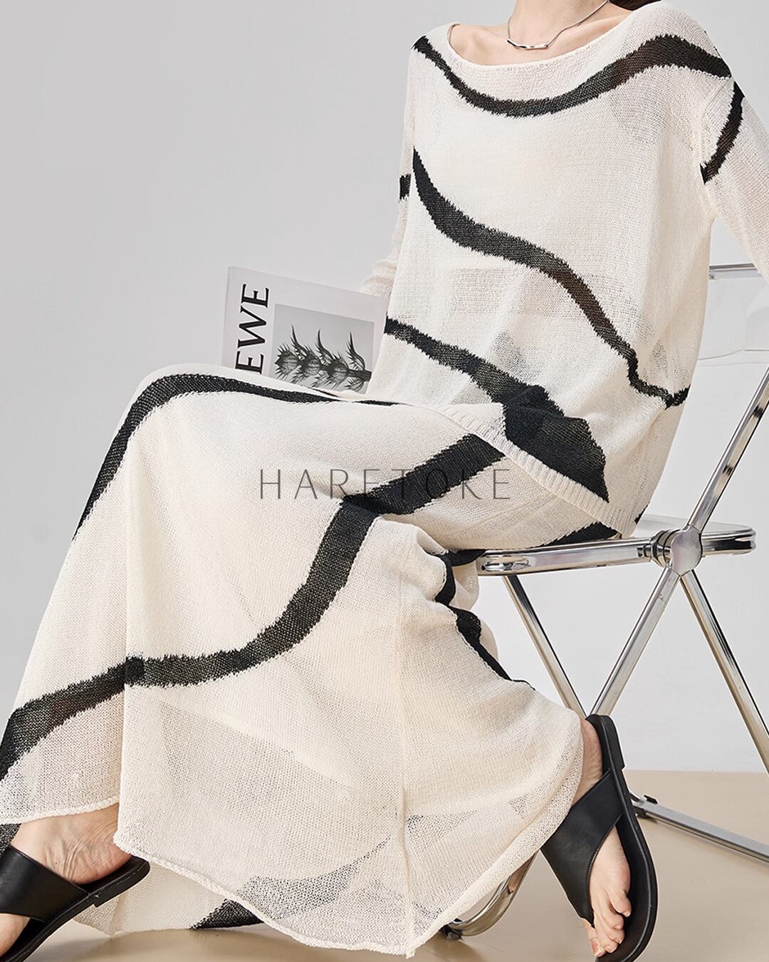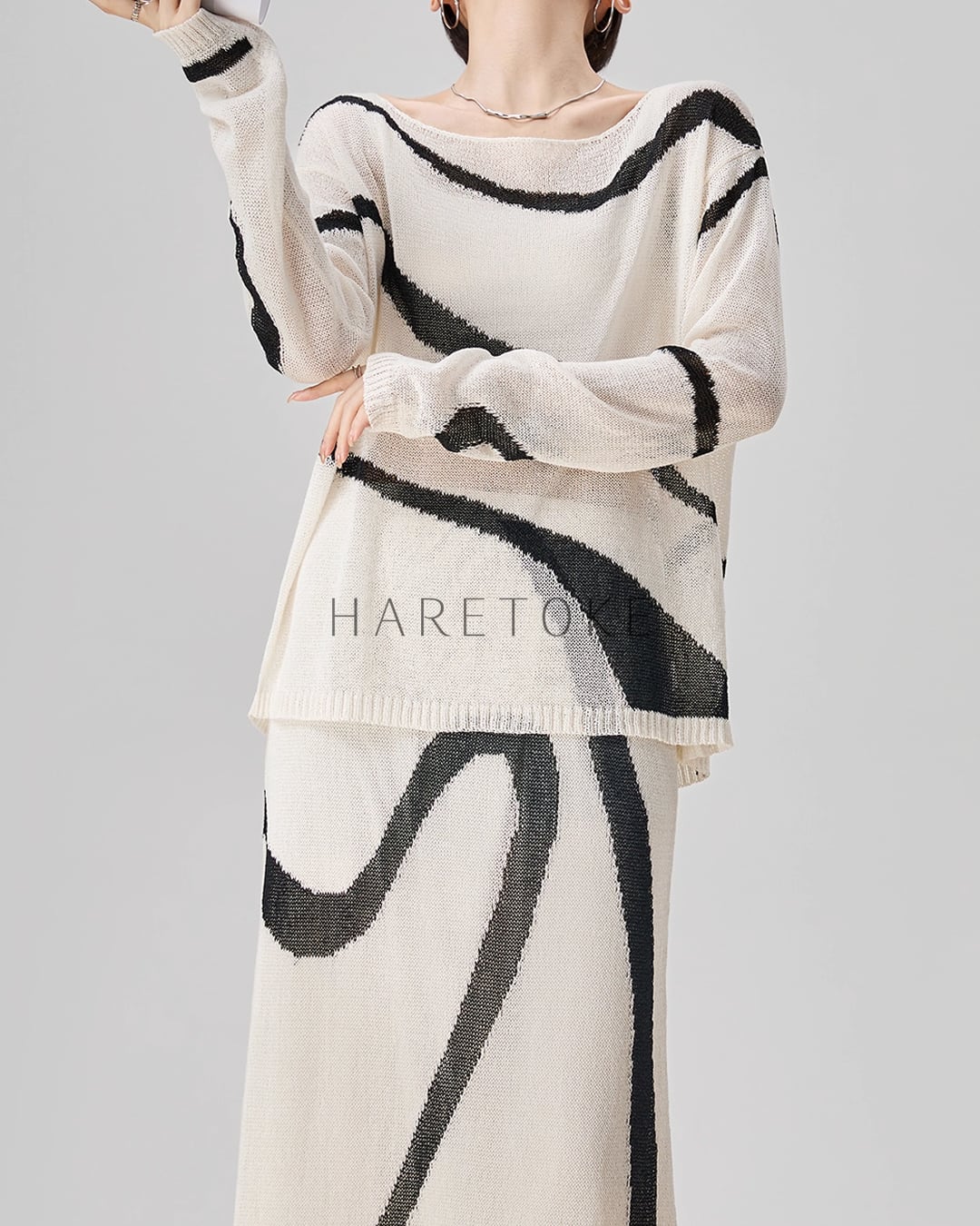 まるで筆で描いたような有機的なラインが印象的な、アートライクなニットアップ。