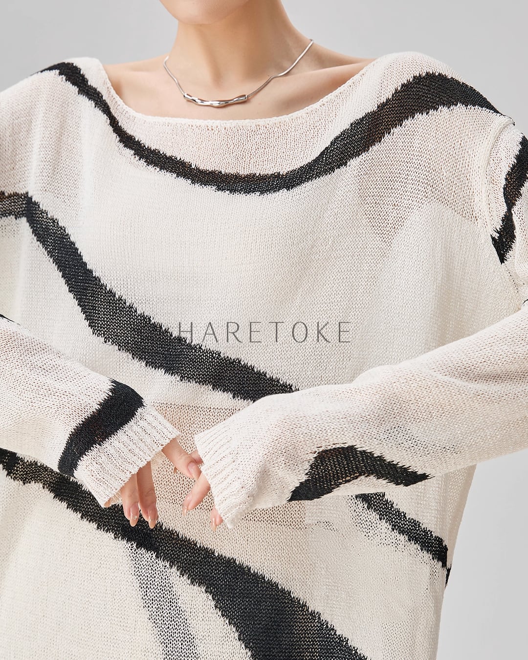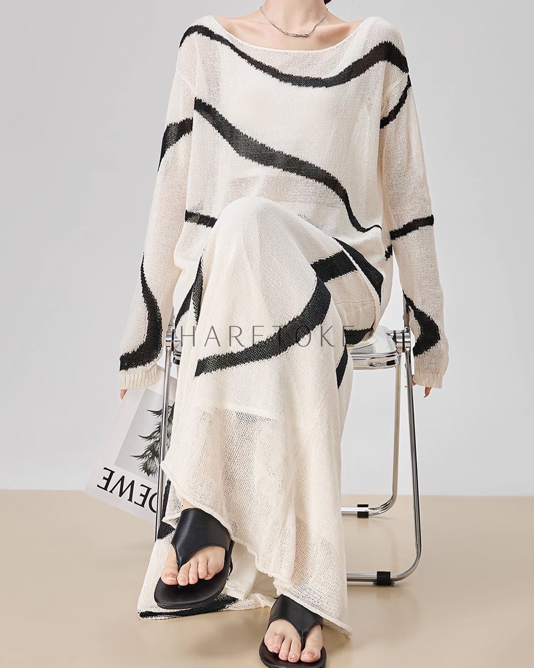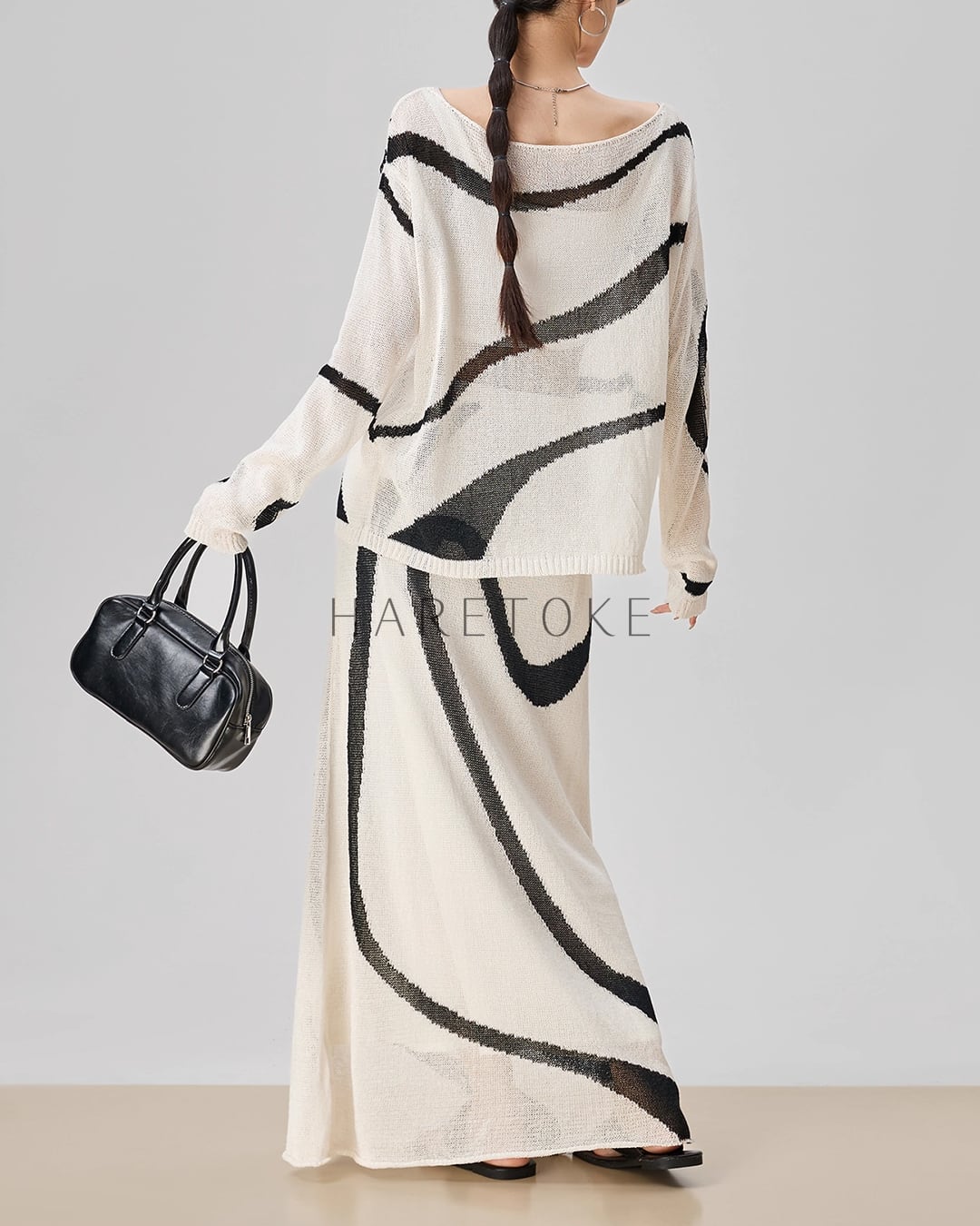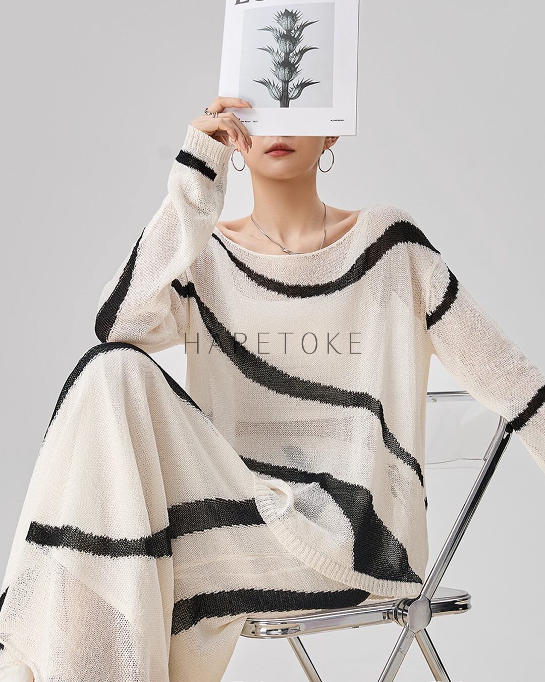 まるで筆で描いたような有機的なラインが印象的な、アートライクなニットアップ。