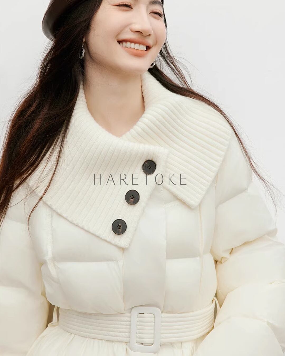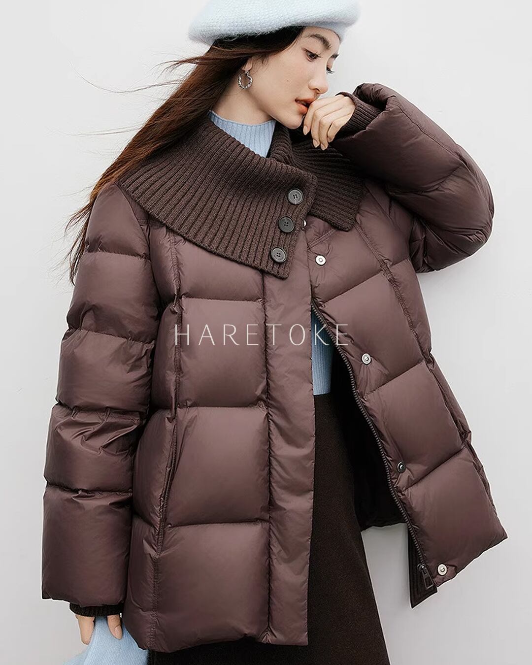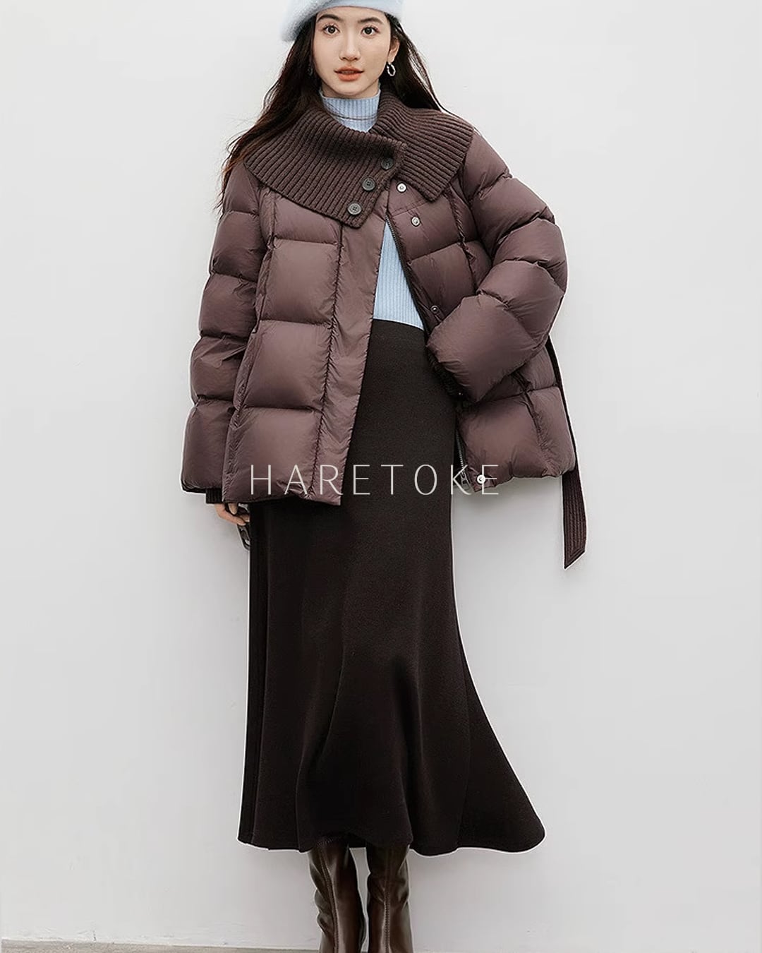 存在感のあるニット切り替え襟が顔まわりを優しく包み、